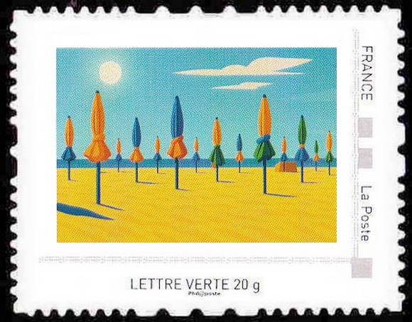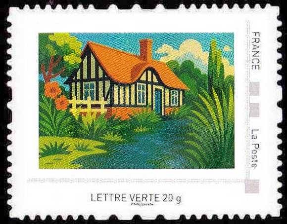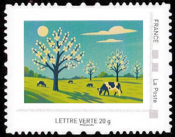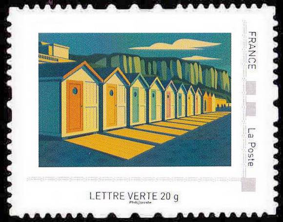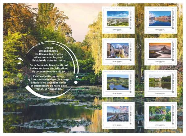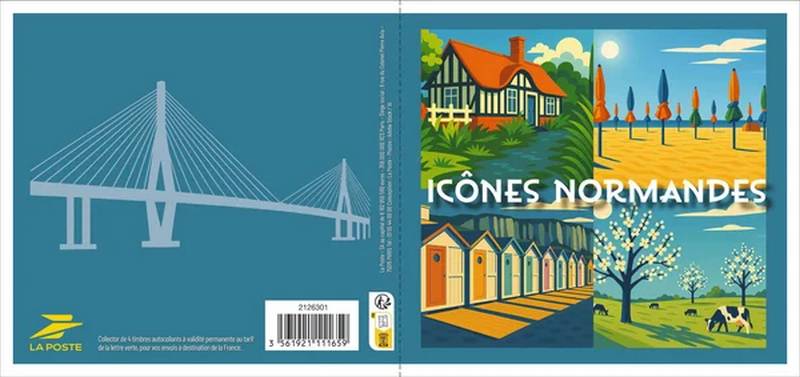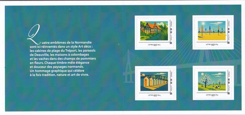 Quatre emblèmes de la Normandie sont ici réinventés dans un style Art déco : les cabines de plage du Tréport, les parasols de Deauville, les maisons à colombages et les vaches dans des champs de pommiers en fleurs. Chaque timbre mêle, élégance et douceur des paysages normands.