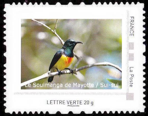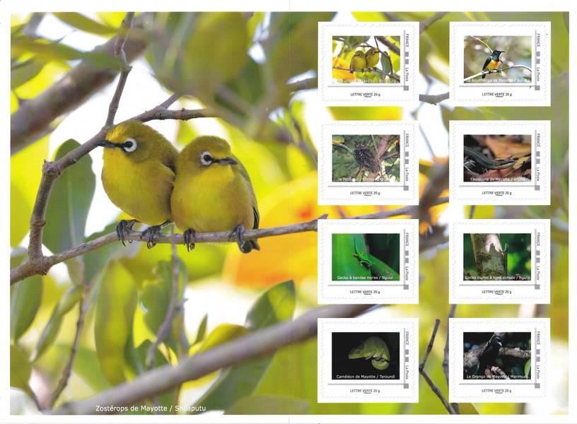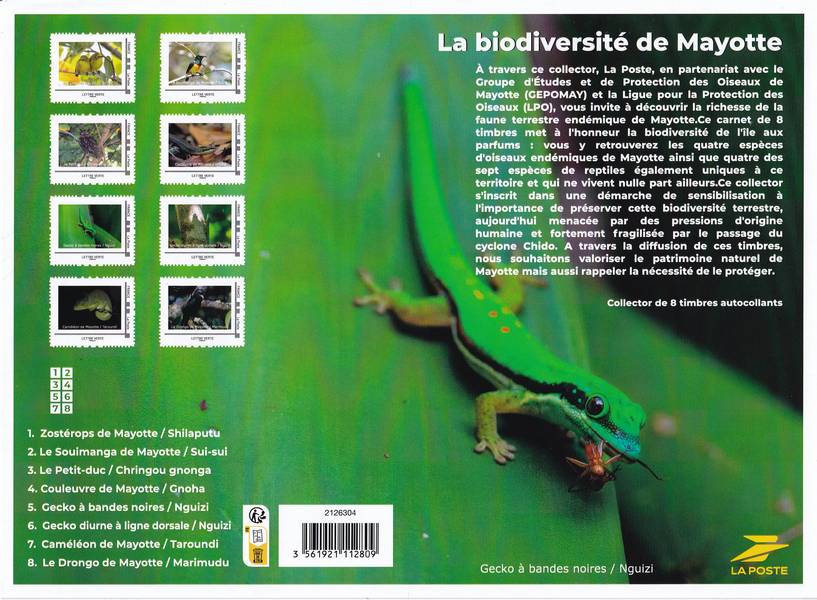 À travers ce collector, La Poste, en partenariat avec le Groupe d'Études et de Protection des Oiseaux de Mayotte (GEPOMAY) et la Ligue pour la Protection des Oiseaux (LPO), vous invite à découvrir la richesse de la faune terrestre endémique de Mayotte. Ce carnet met à l'honneur la biodiversité de l'île aux parfums : vous y retrouverez les quatre espèces d'oiseaux endémiques de Mayotte aussi que quatre des sept espèces de reptiles également uniques à ce territoire et qui ne vivent nulle part ailleurs. Ce collector s'inscrit dans une démarche de sensibilisation à l'importance de préserver cette biodiversité terrestre, aujourd'hui menacée par des pressions d'origine humaine et fortement fragilisée par le passage du cyclone Chido. À travers la diffusion de ces timbres, nous souhaitons valoriser la patrimoine naturel de Mayotte mais aussi rappeler la nécessité de la protéger. ■