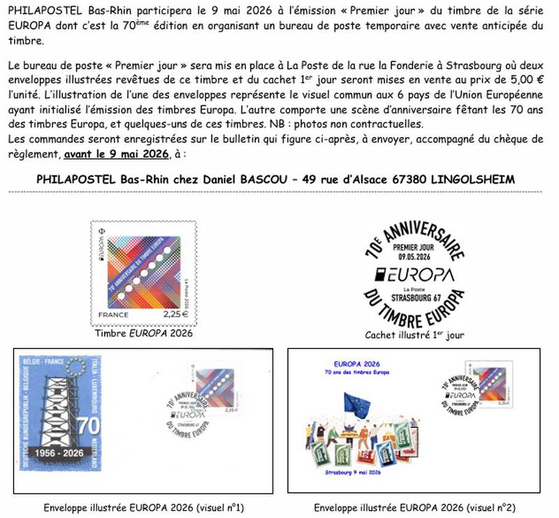 PJ timbre Europa 2026 avec Philapostel Bas-Rhin21 Avril 2026