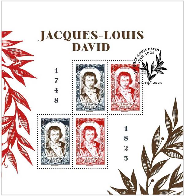 Ce bloc a été créé à l’occasion à l’occasion du bicentenaire de la mort de Jacques-Louis David. Il reprend le timbre d’après un autoportrait de David dessiné et gravé par René Cottet, émis en 1950.