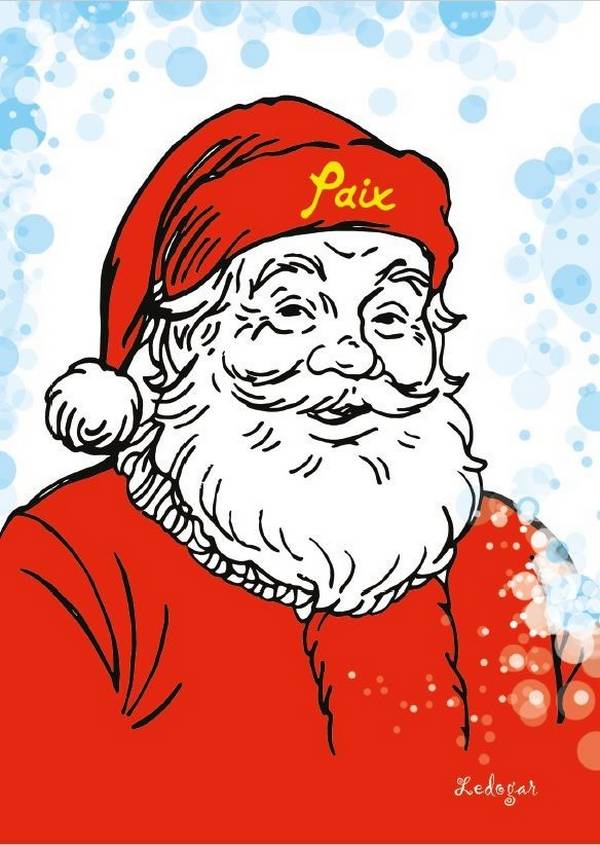 Cette année c'est un Père Noël souriant, plein de bonhommie que propose l'illustrateur. Mais en ces temps où le monde connait de nombreux conflits, il rêve de paix !