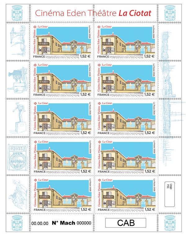 La Poste émet un timbre sur le cinéma Eden Théâtre situé à La Ciotat, le plus ancien cinéma du monde en activité à l'occasion des 130 ans du cinématographe.